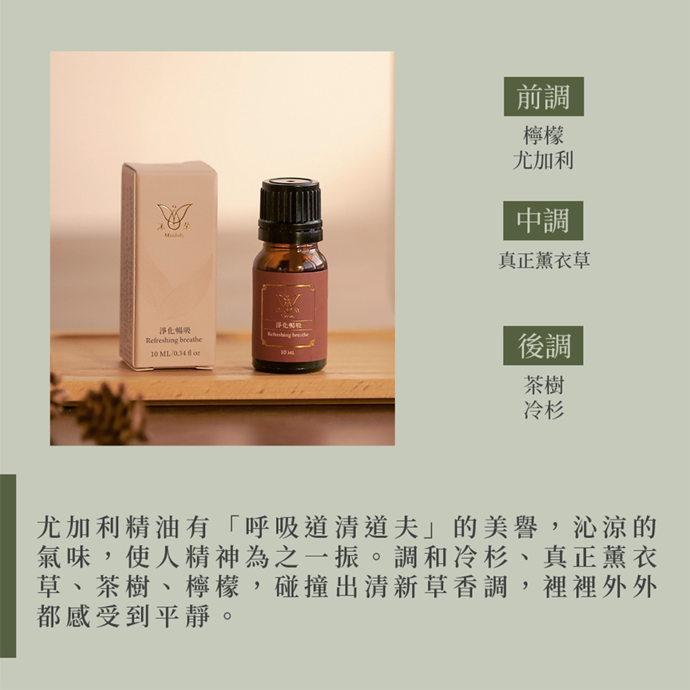 尤加利精油有「呼吸道清道夫」的美譽,沁涼的氣味,使人精神為之一振。調和冷杉、真正薰衣草、茶樹、檸檬,碰撞出清新草香調,裡裡外外都感受到平靜。