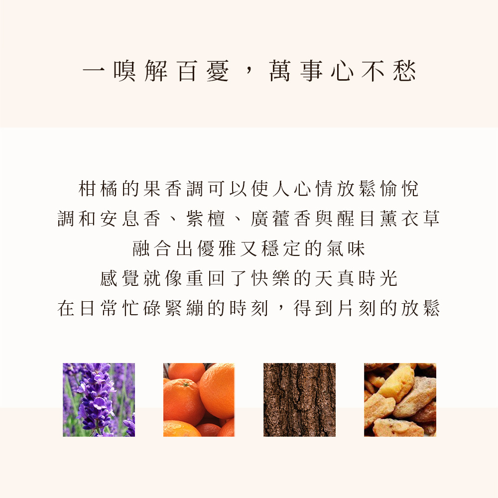 柑橘的果香調可以使人心情放鬆愉悅,調和安息香、松樹、紫檀、廣藿香及醒目薰衣草。木質與花果之調,融合出優雅又穩定的氣味。感覺就像與春草大地之息接軌,重回了快樂的天真時光,讓您在日常忙碌緊繃的時刻,能得到片刻的跳脫和身心靈放鬆。